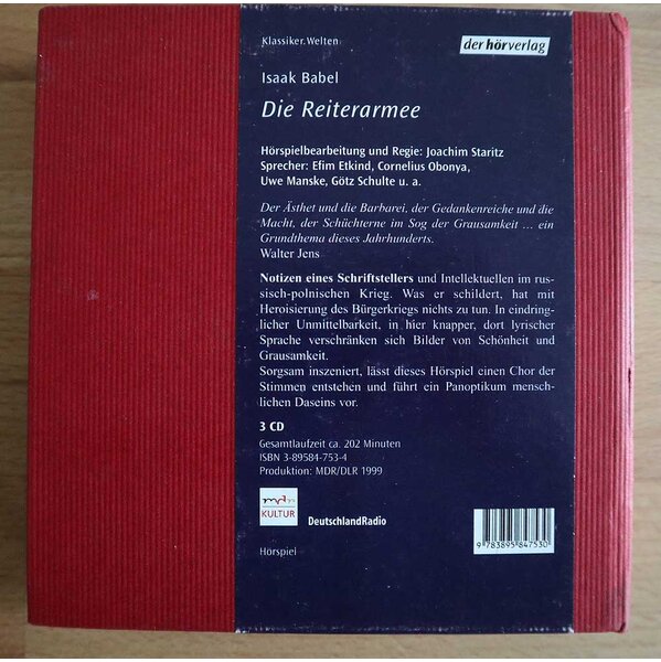 Notizen eines Schriftstellers und Intellektuellen im russisch-polnischen Krieg. Was er schildert, hat mit Heroisierung des Bürgerkriegs nichts zu tun. In eindringlicher Unmittelbarkeit, in hier knapper, dort lyrischer Sprache verschränken sich Bilder von Schönheit und Grausamkeit. Sorgsam inszeniert, lässt dieses Hörspiel einen Chor der Stimmen entstehen und führt ein Panoptikum menschlichen Daseins vor.