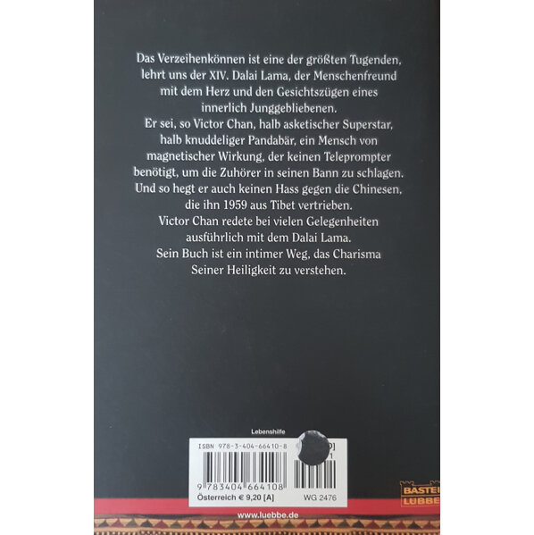 Das Verzeihenkönnen ist eine der größten Tugenden, lehrt uns der XIV. Dalai Lama, der Menschenfreund mit dem Herz und den Gesichtszügen eines innerlich Junggebliebenen. Er sei, so Victor Chan, halb asketischer Superstar, halb knuddeliger Pandabär, ein Mensch von magnetischer Wirkung, der keinen Teleprompter benötigt, um die Zuhörer in seinen Bann zu schlagen. Und so hegt er auch keinen Hass gegen die Chinesen, die ihn 1959 aus Tibet vertrieben. Victor Chan redete bei vielen Gelegenheiten ausführlich mit dem Dalai Lama. Sein Buch ist ein intimer Weg, das Charisma Seiner Heiligkeit zu verstehen.