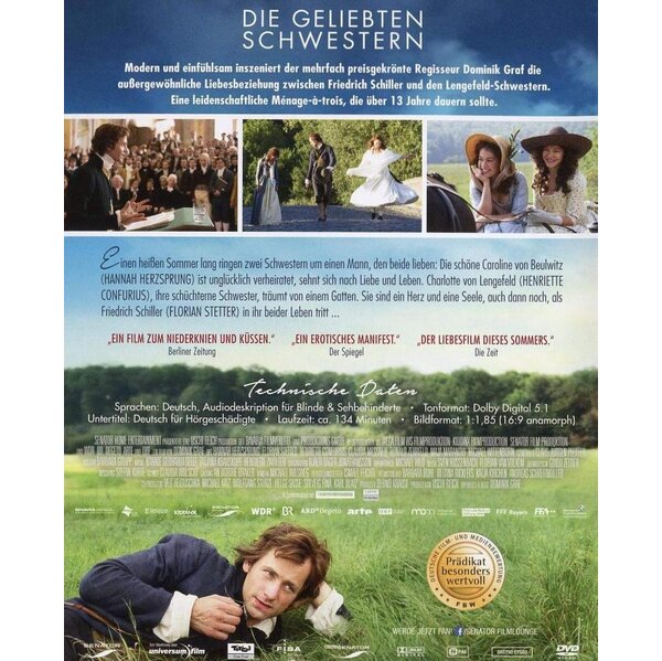 Dominik Grafs 'Die geliebten Schwestern', eine epische Liebesgeschichte über eine leidenschaftliche Ménage-à-trois, die im Sommer 1788 ihren Anfang nimmt. Nach 'Der Felsen' (2002), 'Der Rote Kakadu' (2005) oder 'Im Angesicht des Verbrechens' (2010) präsentierte Filmemacher Dominik Graf, der auch das Drehbuch schrieb, 'Die geliebten Schwestern' mit großem Erfolg auf der Berlinale 2014. Der vielfach ausgezeichnete Regisseur - u.a. 10 Grimme-Preise, Deutscher- und Bayerischer Fernsehpreis) - der regelmäßig mit seinen herausragenden TV-Arbeiten für große Aufmerksamkeit sorgt, inszenierte diese große Liebesgeschichte dreier Figuren, die 13 Jahre überdauert. Die Hauptrollen spielen Hannah Herzsprung (u.a. aus 'Der Geschmack von Apfelkernen', 'Hell', 'Der Vorleser', 'Vier Minuten'), Florian Stetter (u.a. aus 'Nanga Parbat', 'Sophie Scholl', 'Die Freunde der Freunde') und Henriette Confurius ('Mein erstes Wunder', 'Der ganz große Traum'). Komplettiert wird das hochkarätige Darstellerensemble durch Claudia Messner ('Der Rausschmeißer'), Anne Schäfer ('Jasmin'), Maja Maranow ('Der Schattenmann', 'Ein starkes Team'), Ronald Zehrfeld ('Barbara', 'Der Rote Kakadu') und viele andere. Erfolgsproduzentin Uschi Reich (u.a. 'Im Winter ein Jahr', 'Der Geschmack von Apfelkernen', 'Bibi Blocksberg', 'Das fliegende Klassenzimmer', 'Pünktchen und Anton') produzierte für Bavaria Filmverleih- und Produktions GmbH. Der Film wurde gefördert von der Mitteldeutschen Medienförderung (MDM), der Film- und Medienstiftung NRW, dem FilmFernsehFonds Bayern (FFF), der Filmförderungsanstalt (FFA) und dem Deutschen Filmförderfonds (DFFF).