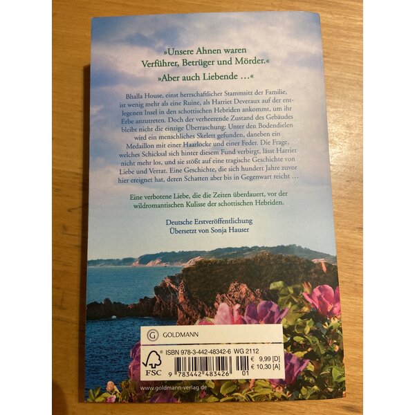 Bhalla House, einst herrschaftlicher Stammsitz der Familie, ist wenig mehr als eine Ruine, als Harriet Deveraux auf der entlegenen Insel in den schottischen Hebriden ankommt, um ihr Erbe anzutreten. Doch der verheerende Zustand des Gebäudes bleibt nicht die einzige Überraschung: Unter den morschen Bodendielen wird ein menschliches Skelett gefunden, daneben ein Medaillon mit einer Haarlocke und einer Feder. Die Frage, welches Schicksal sich hinter diesem Fund verbirgt, lässt Harriet nicht mehr los, und sie stößt auf eine tragische Geschichte von Liebe und Verrat. Eine Geschichte, die sich hundert Jahre zuvor hier ereignet hat, deren Schatten aber bis in Gegenwart reicht ...
