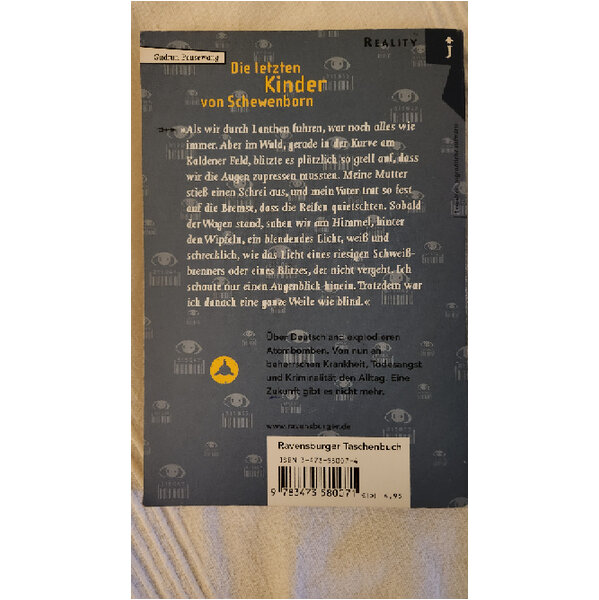 Über Deutschland explodiert eine Atombombe. Von nun an beherrschen Krankheit, Todesangst und Kriminalität den Alltag. Eine Zukunft gibt es nicht mehr. Gudrun Pausewang entwirft ein fiktives Szenario, das erschüttert und zum Nachdenken zwingt. Die Autorin erhielt 2017 den Sonderpreis des Deutschen Jugendliteraturpreises für ihr schriftstellerisches Gesamtwerk.