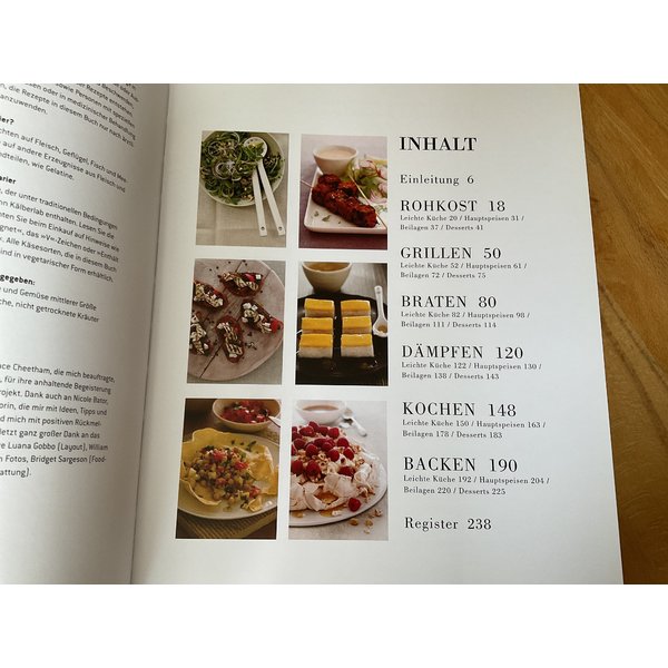 Die Zeiten, in denen fleischlose Gerichte eintönig schmeckten, sind endgültig vorbei. Die moderne vegetarische Küche lockt mit vielfältigen Rezepten, die zum Probieren anregen und unwiderstehliche Alternativen bieten. Dieses Buch versammelt sechs wichtige Zubereitungsarten, mit denen Sie herrliche Speisen zaubern können: Rohkost, Grillen, Braten, Dämpfen, Kochen und Backen. Mittels dieser Garmethoden können Sie das Beste aus den Zutaten herausholen und sich zudem ausgewogen ernähren. Verwöhnen Sie sich und Ihre Lieben z.B. mit Rote-Bete-Carpaccio mit Ziegenkäse, Parmesan-Roulade mit Kürbisfüllung oder Schokoladen-Trüffel-Torte. Bei den 185 Rezepten ist für jeden Geschmack etwas dabei!