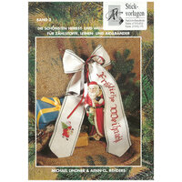 Hier sind viele Kreuzstich-Arbeiten zum Thema Weihnachten und Advent farbig abgebildet. Die Stickmuster und Farbcodes sind in schwarz-weiss zu sehen.