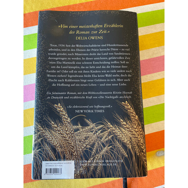 Texas, 1934: Seit der Weltwirtschaftskrise sind Hunderttausende arbeitslos, und in den Ebenen der Prärie herrscht Dürre – zu viel wurde gerodet, nach Missernten droht das Land von Sandstürmen davongetragen zu werden. In dieser unsicheren, gefahrvollen Zeit muss Elsa Martinelli eine schwere Entscheidung treffen: Soll sie um das Land kämpfen, das sie liebt und das die Heimat ihrer Familie ist? Oder soll sie mit ihren Kindern wie so viele andere nach Westen ziehen? Irgendwann bleibt Elsa keine Wahl mehr, doch die Flucht nach Kalifornien birgt neue Gefahren in sich. Aber auch die Hoffnung auf ein neues Leben – und eine neue Liebe.