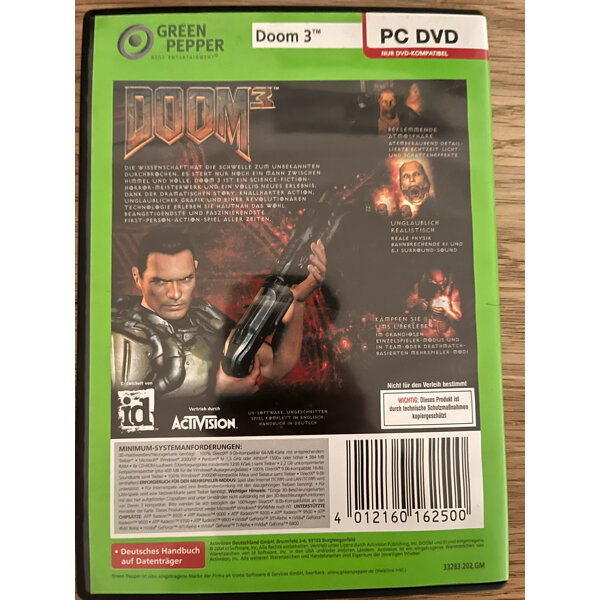 Die Wissenschaft hat die Schwelle zum unbekannten durchbrochen. Es steht nur noch ein Mann zwischen Himmel und Hölle. Doom 3 ist ein Science-Fiction-Horror-Meisterwerk und ein völlig neues Erlebnis. Dank der dramatischen Story, knallharter Action, unglaublicher Grafik und einer revolutionären Technologie erleben sie hautnah das wohl beängstigendste und faszinierendste First-Person-Action-Spiel aller Zeiten.