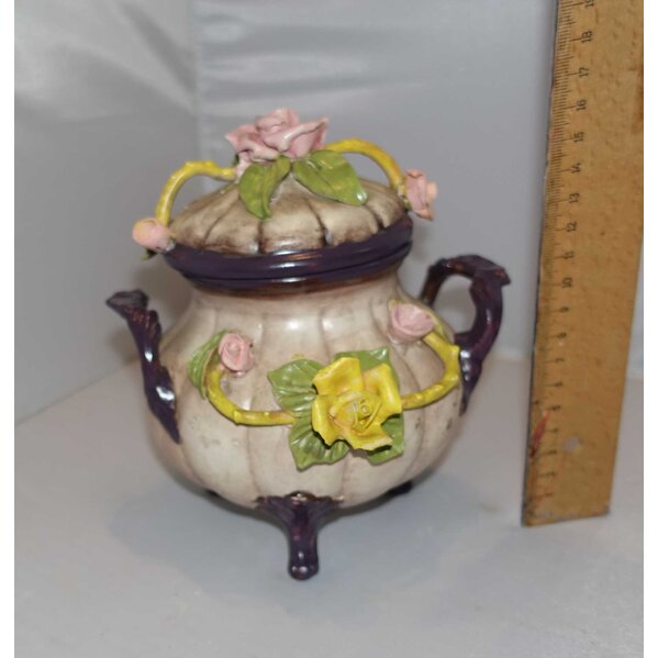 Herstellerbeschreibung: Die Vintage-Vase Bassano, hergestellt in Italien in den 1960er- und 1970er-Jahren, ist ein exquisites Produkt aus Keramik. Die 18 cm hohe Vase wird durch elegante Füße ergänzt und verfügt über einen charmanten Deckel, der ihr zusätzlichen Charme verleiht. Die Hauptverzierung des Produkts sind kunstvoll gefertigte, voluminöse Blumen, die reichlich auf der Oberfläche verteilt sind. Diese floralen Elemente, die im traditionellen Bassano-Stil gefertigt sind, verleihen der Vase ein bezauberndes und romantisches Aussehen. Bassano ist eine Stadt in Italien, die für ihre Keramikproduktion bekannt ist.