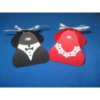 12 kleine Geschenkverpackungen für Give aways o.ä., in den Farben rot und schwarz, mit aufgesetztem Hemdkragen und Fliege, bzw. mit Halskette.