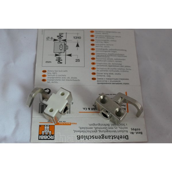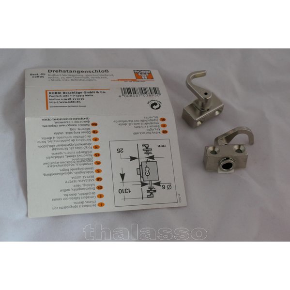 Zweimal Drehstangenschloss für Schranktüren, das sind die beweglichen kleinen Haken oben und unten an Schranktüren, die den Schrank verschließen, wenn man am Knauf dreht.
