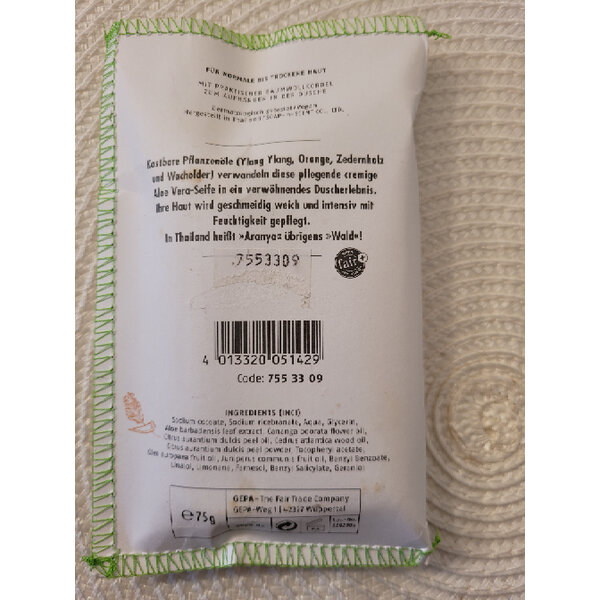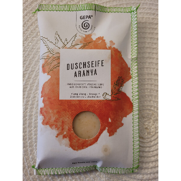 Handgemachte, vegane Seife aus Changmai/Thailand. Mit Ylang Ylang, Orange, Zedernholz und Wacholder.