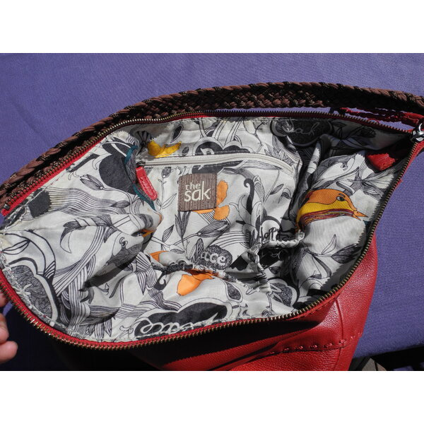 Das farbige Innenteil hat ein seitliches Reißverschlußfach von ca. 19cm Breite, auf der gegenüber liegenden 2 Einschübe für z.B. Schlüssel.