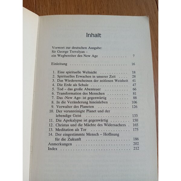 Inhalt: Eine spirituelle Weltsicht, Das Wiedererscheinen in unserer Weisheit, Die Erde als Schule, Transformationen des Menschen, Christus und die Mächte des Widersachers, Meditation als Tor, Verwalter des Planeten, Der eingestimmte Mensch als Hoffnung, die Apokalypse ist allgegenwärtig; Der verunreinigte Geist und der lebendige Geist, Tod-Das große Abenteuer;
