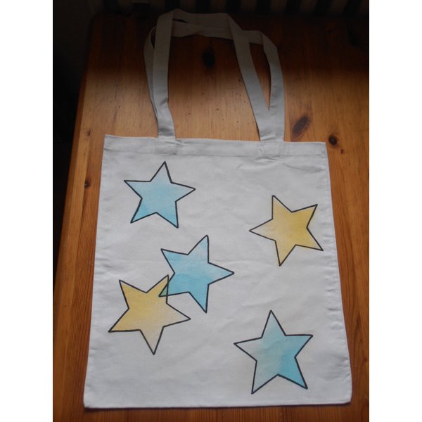 Stofftasche mit Sternen drauf und langen Henkeln. Super für anstehenden Einkäufe. Die Tasche ist ca. 38 x 40cm groß. Sie ist neu und wurde einseitig handbemalt, andere Seite unifarben weiß (die Farbe wurde mit Bügeleisen fixiert, trotzdem bitte nur Handwäsche, da sonst die Tasche höchstwahrscheinlich einläuft).