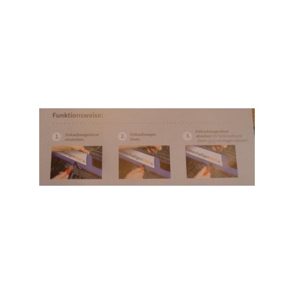 Einkauswagenlöser, geniales Teil. Man braucht keinen Chip mehr oder 1 Euro Münze. Einkaufswagen ablösen und Einkaufswagenlöser wieder entfernen, muß nicht im Einkaufswagen bleiben.