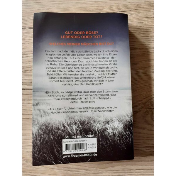 Kirstie oder Lydia?Gut oder böse?Lebendig oder tot?Ein Jahr nachdem die sechsjährige Lydia durch einen tragischen Unfall ums Leben kam, sind ihre Eltern Sarah und Angus psychisch am Ende. Um neu anzufangen, ziehen sie zusammen mit Lydias Zwillingsschwester Kirstie auf eine atemberaubend schöne Privatinsel der schottischen Hebriden. Doch auch hier finden sie keine Ruhe. Kirstie behauptet steif und fest, sie sei in Wirklichkeit Lydia und die Eltern hätten den falschen Zwilling beerdigt. Bald hüllen Winternebel die Insel ein, Angus ist beruflich oft abwesend, und bei Sarah schleicht sich das unheimliche Gefühl ein, etwas stimme nicht. Zunehmend fragt sie sich, welches ihrer Mädchen lebt. Als ein heftiger Sturm aufzieht, sind Sarah und Kirstie komplett isoliert und den Geistern der Vergangenheit ausgeliefert.