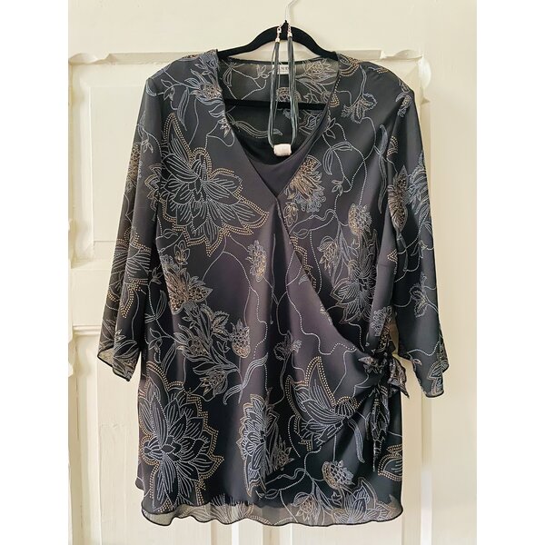 Dazu gibt es ein Oberteil in Wickelform mit Schulterpolstern. Hier ist die Marke Canda.