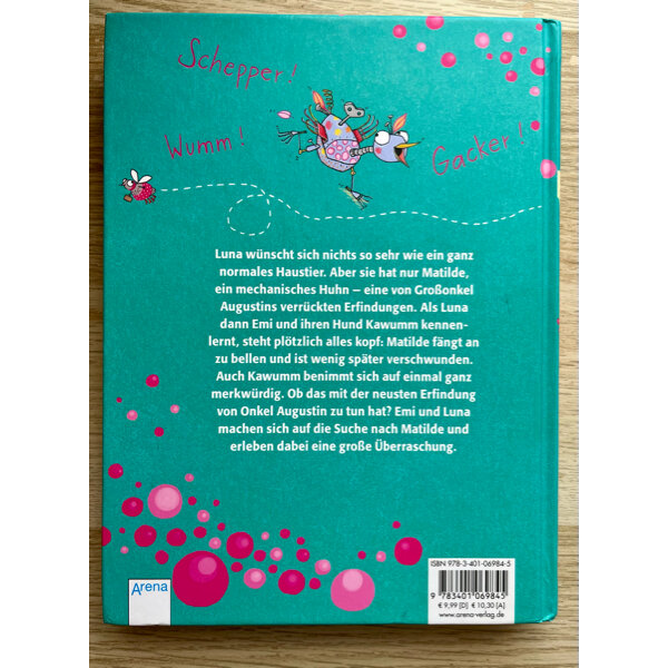 Luna wünscht sich nichts sehnlicher als ein lebendiges Haustier. Aber sie hat leider nur Matilde, ein mechanisches Huhn. Dann lernen die beiden Emi und Hundewelpen Kawumm kennen und plötzlich steht alles Kopf und Matilde fängt an zu bellen! Ob das mit der neuen Erfindung von Großonkel Augustin zu tun hat? Emi und Luna ahnen nicht, dass noch viel merkwürdigere Dinge passieren werden.