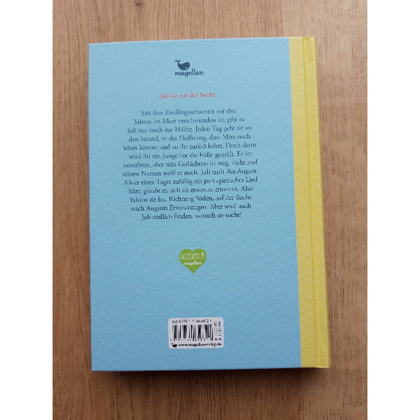 Juli findet den namenlosen Jungen an einem rauen Sommertag, angespült an die Küste. Körperlich scheint ihm nichts zu fehlen, aber er hat sein Gedächtnis verloren, nicht einmal seinen Namen weiß er noch. Also tauft sie ihn August und beschließt, ihm bei seiner Suche nach der Erinnerung zu helfen. Dabei ist Juli selbst auf der Suche. Seit ihre Zwillingsschwester Mira vor drei Jahren im Meer verschwunden ist, gibt es Juli nur noch zur Hälfte. Wie soll sie einfach weitermachen, wenn Mira vielleicht doch noch leben könnte? Gemeinsam mit August haut Juli ab, sie fahren Richtung Süden. Dort wollen sie mehr über August herausfinden, denn ein portugiesisches Lied hat bei ihm etwas ausgelöst. Aber auf was werden sie in Portugal stoßen? Und kann auch Juli ihre Suche endlich abschließen?