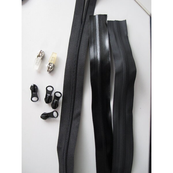 Wasserfeste Endlosreißverschlüsse. Die Oberseite des Bandes ist mit einer wasserabweisenden Beschichtung versehen, die Spirale liegt innen. Daher sind diese Reißverschlüsse dauerhaft wasser- und schmutzabweisend.