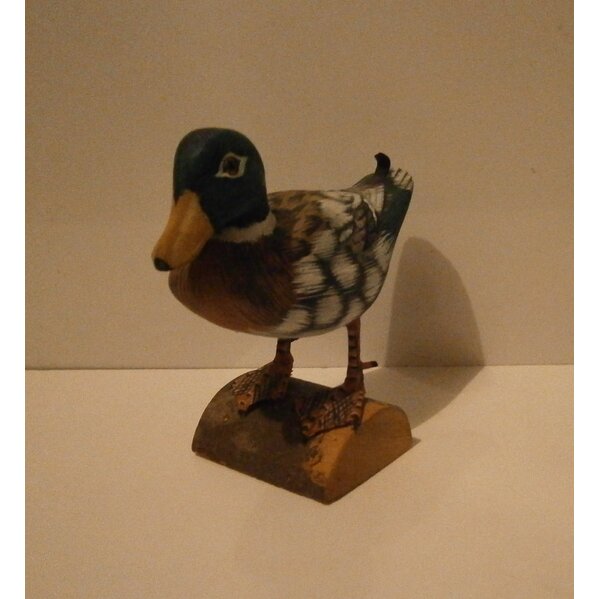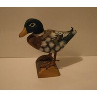 Ente, Stockente, nach der Farbe ein Erpel, Holz, bemalt, auf einem Stück naturbelassenen Holz montiert. Sehr realistisch. Der hübsche Kerl ist etwa 10 cm hoch und 9 cm lang.