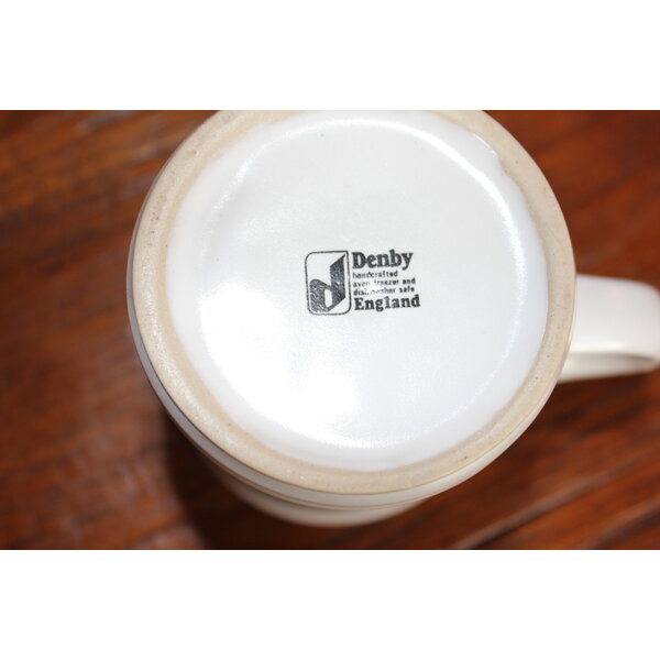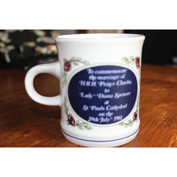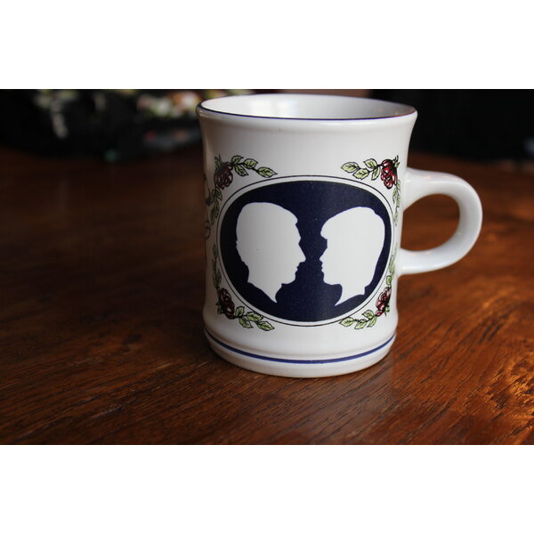 Der wertige Becher aus der Denby Pottery in Mittelengland wurde zum Anlass der Vermählung von Charles und Diana hergestellt und zeigt vorne einen Scherenschnitt vom Profil von Charles und Diana. Hinten steht der Text: To Commemorate the marriage of H.R H Prince Charles to Lady Diana Spencer at St. Pauls Cathedral on the 29th July 1981.