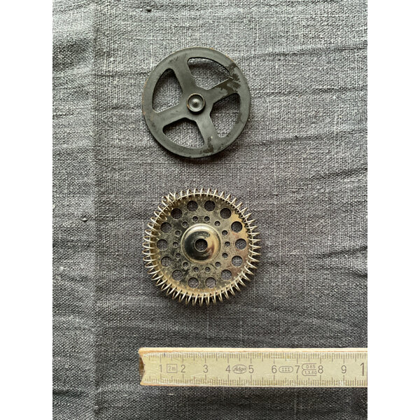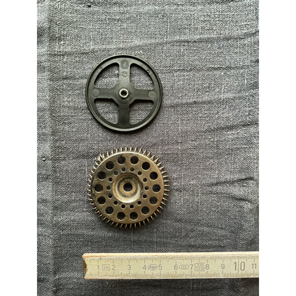 Schwarzes Kunststoffteil mit stärkeren Gebrauchsspuren, Metallteil sehr gut