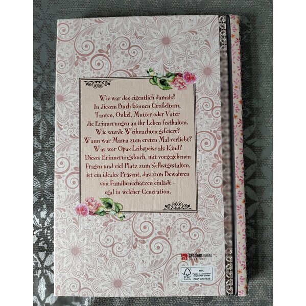 Eintragbücher und Blankbooks werden immer wieder vielfältig genutzt z.B. als Tagebuch, Gästebuch, Freundschaftsbuch, zur Haushaltsführung oder einfach nur als allgemeines Notizbuch. Hochwertige Eintragbücher dienen oft auch als persönliches Geschenk für gute Freunde und Verwandte. Schaffen sie bleibende Erinnerungen und notieren sie alles, was sie nicht vergessen möchten! Erzähl aus deinem Leben Wie war das eigentlich damals? In diesm Buch können Großeltern,Tanten, Onkel, Mutter oder Vater die Gedanken an ihr Leben festhalten. Wie wurde Weihnachten gefeiert? Wann war Mama zum ersten Mal verliebt? Was war Opas Leibspeise als Kind? Dieses Erinnerungsbuch mit vorgegebenen Fragen und viel Platz zum Selbstgestalten, ist ein ideales Präsent, das zum Bewahren von Familienschätzen einlädt - egal in welcher Generation. Ausstattung: Format ca. 16 x 24 cm Inhalt 128 Seiten Außen 4-farbig, innen 1-farbig Hardcover mit Coververedelung