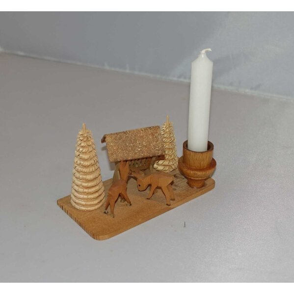 schönes kleines Ensemble, original Erzgebirge. Mindestens 50 jahre alt. es fehlte rechts eine Figur. Die Stelle wurde mit einem Kerzenhalter (ebenfalls Erzgebirge) ergänzt. Der Kerzenhaöter hat einen leichten Abplatzer. für kleine Kerzen (Pyramidenkerzengröße). nur sehr leichte Gebrauchsspuren