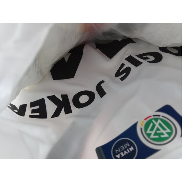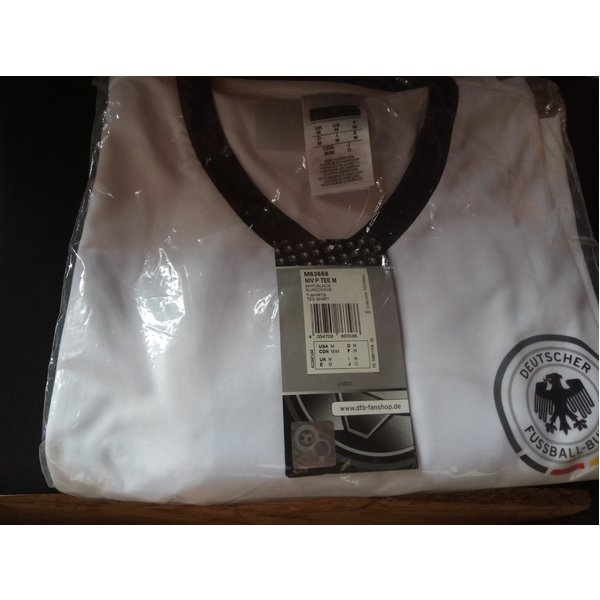 DFB Fanshirt im Trikot Style schwarz-weiß. Vorn ein Druck DFB Logo, hinten mit Aufdruck Jogis Joker und Rückennummer 14, denke ich. Größe M, ich habe es für mich damals bestellt, hatte dann aber woanders ein echtes Trikot erbeutet. Daher seit damals in der Schublade und nie ausgepackt.