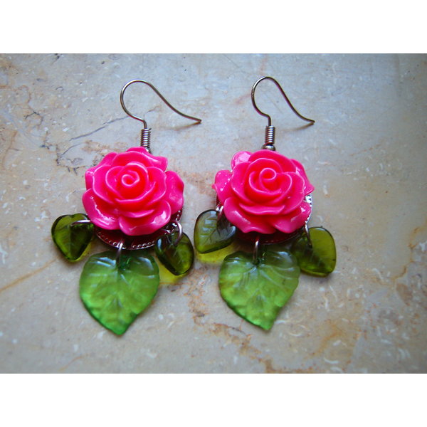 Die Ohrringe sind ca. 5,2 cm lang, der Durchmesser der Blüte beträgt ca. 2 cm. Die drei Blätter baumeln locker unterhalb der Blume, Ohrhaken sind lt. Hersteller nickelfrei.