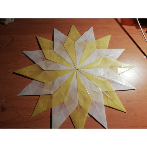Handgefaltete Transparentsterne, durch die verschiedenen Lagen entstehen schöne Effekte