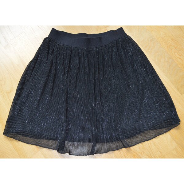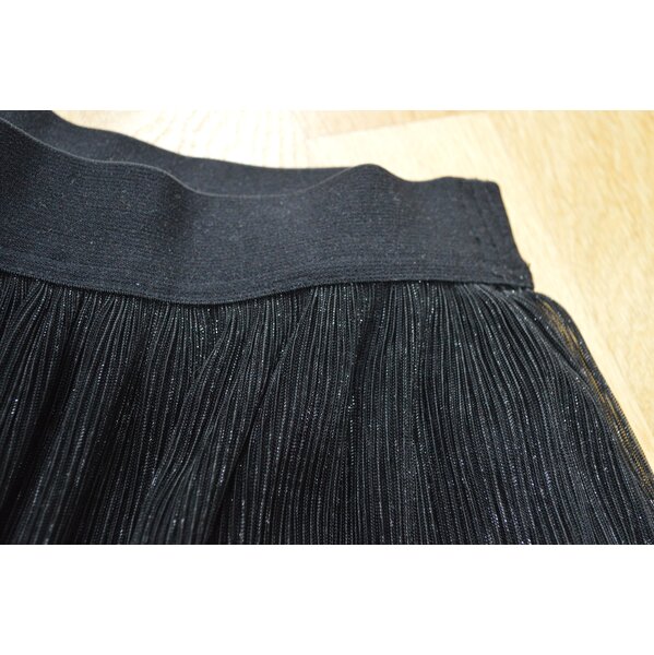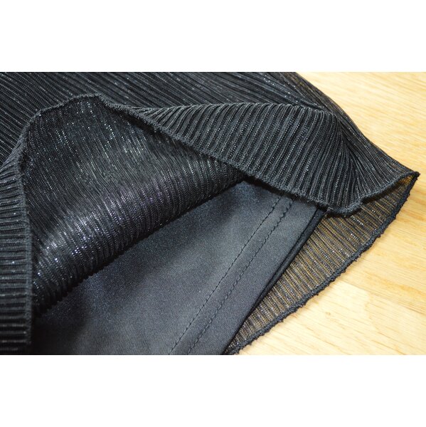 Feiner zweilagiger Rock, unter einem transparenten schwarzen geriffelten Stoff mit Silberschimmer ist ein blickdichter schwarzer Unterrock. Total bequem mit elastischem breitem Taillengummi, einfach zum Reinschlüpfen ohne Verschlüsse.