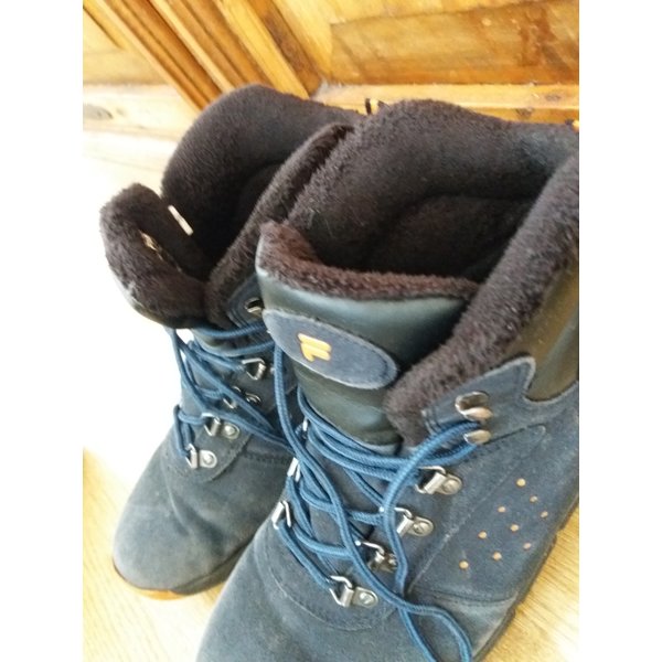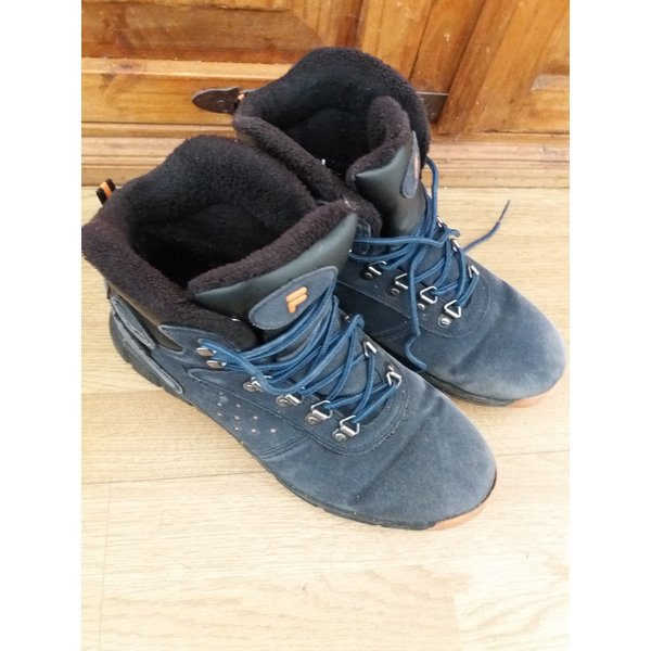 stabile Boots von Fila, mit Metallösen, der Schuh ist aus Wildleder mit rutschfestem Profil, der obere Teil ist aus Glattleder, gefüttert, Farbe dunkelblau und orange, Innenlänge ca 25 cm, schwer genau zu messen, wie auf dem Bild zu sehen ist der hintere Teil etwas abgelaufen, da die Sohle nicht durchgeärbt ist, sieht man dort schwarz, ohne Einschränkung der Funktion