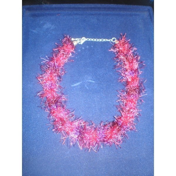 Die flauschigweiche Kette schmiegt sich kuschelig an den Hals ihrer Trägerin an und lenkt alle Blicke auf sich mit ihren strahlenden Farben in Rot und Violett.
