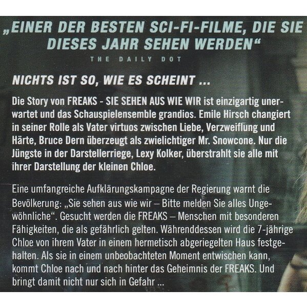 Eine umfangreiche Aufklärungskampagne der Regierung warnt die Bevölkerung: „Sie sehen aus wie wir – Bitte melden Sie alles Ungewöhnliche“. Gesucht werden die FREAKS – Menschen mit besonderen Fähigkeiten, die als gefährlich gelten. Währenddessen wird die 7-jährige Chloe von ihrem Vater in einem hermetisch abgeriegelten Haus festgehalten. Als sie in einem unbeobachteten Moment entwischen kann, trifft sie auf den mysteriöse Eismann Mr. Snowcone. Der alte Mann zeigt ihr die Welt außerhalb ihres tristen Wohnhauses. Nach und nach kommt Chloe hinter das Geheimnis der FREAKS. Und bringt damit nicht nur sich in Gefahr …