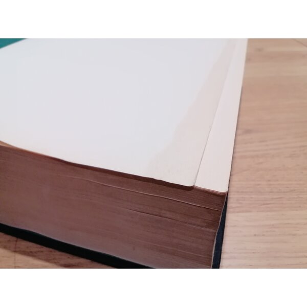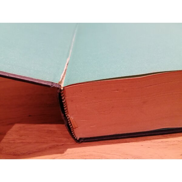 Falz hinten mit kleineren Einriß (s. Fotos), Rücksatz hinten gering fleckig, ohne Einträge
