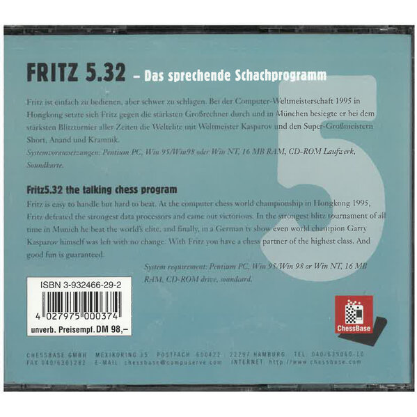 Dies ist die Version 5.32 des legendären sprechenden Schachprogramms Fritz. Der Neupreis betrug damals 98 DM (ist auf Bild 2 zu sehen).