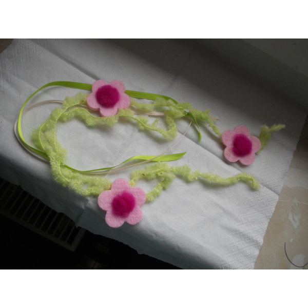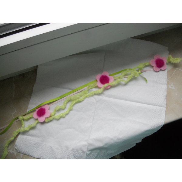 Tischdeko oder zum Hängen. Die Filzblüten sind noch in der Mitte handgefilzt. Bänderstrang, hellgrün rosa.