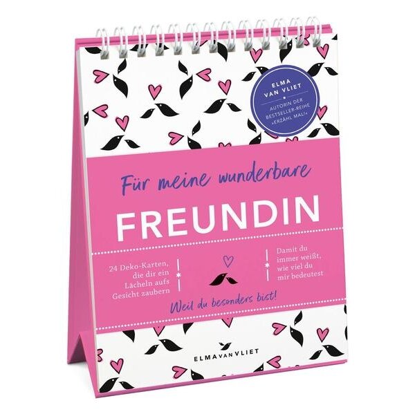 „Für meine wunderbare Freundin“ ist das perfekte Geschenk für die Freundin: Dieses dekorative Buch zum Aufstellen enthält 24 kleine Liebeserklärungen und schöne Sprüche, die der Freundin ein Lächeln aufs Gesicht zaubern. „Für meine wunderbare Freundin“ ist ein wunderbares Geschenk zum Freundinnentag, zum Geburtstag, zu Weihnachten ‒ oder einfach für zwischendurch. Denn Wertschätzung ist das Schönste, was man verschenken kann.• Spiral-Aufsteller mit 24 liebevollen Sprüchen• Format: 12,5 x 16,5 x 8,5 cm• Die Seiten sind perforiert, so dass die Freundin einzelne Seiten auch heraustrennen und sie als Deko-Karten an einem Ort, der ihr dafür gut gefällt, aufhängen oder aufstellen kann• Ein wunderbares Geschenk zum Freundinnentag, zum Geburtstag, zu Weihnachten oder einfach für zwischendurch• Ein wertschätzendes Geschenk für die Freundin, das sagt: „Es ist schön, dass es dich gibt!“Überraschen Sie ihre Freundin mit diesem liebevoll gestalteten Buch ...