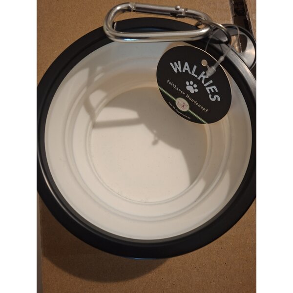 Gut für unterwegs, da faltbar. Durchmesser oben ca. 15 cm. Mit praktischem Karabinerhaken, um den Napf z.B. am Gitter der Transportbox griffbereit einzuhaken.