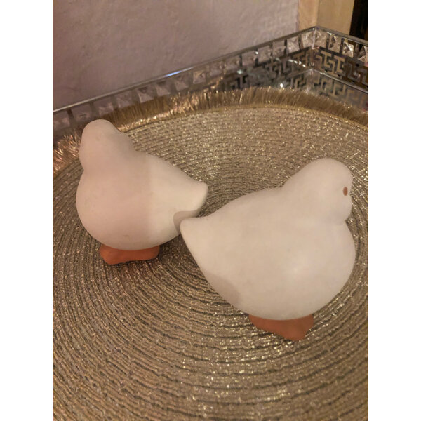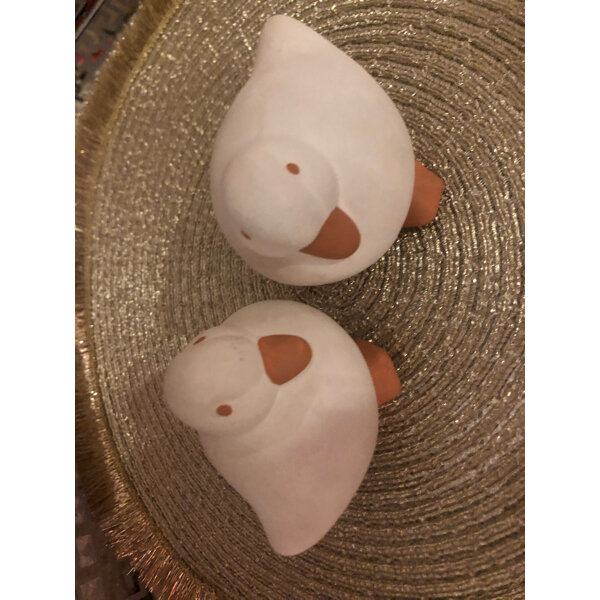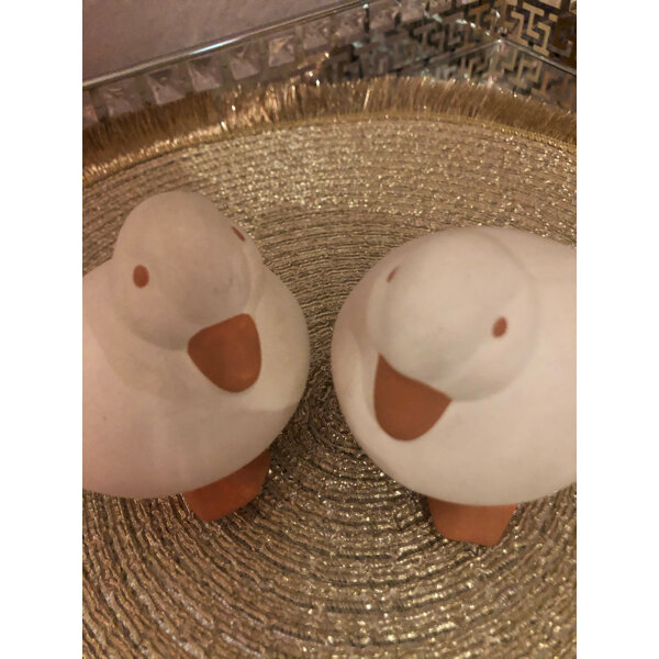 Guter Zustand. Wurden ein paar Mal als Deko eingesetzt. Niedliche Figuren. Da sie weiß sind, sehe ich sie eher als Gänse an. Können aber auch Enten sein. Sind aus Keramik. Höhe 9 cm. Breite 8,5 cm.