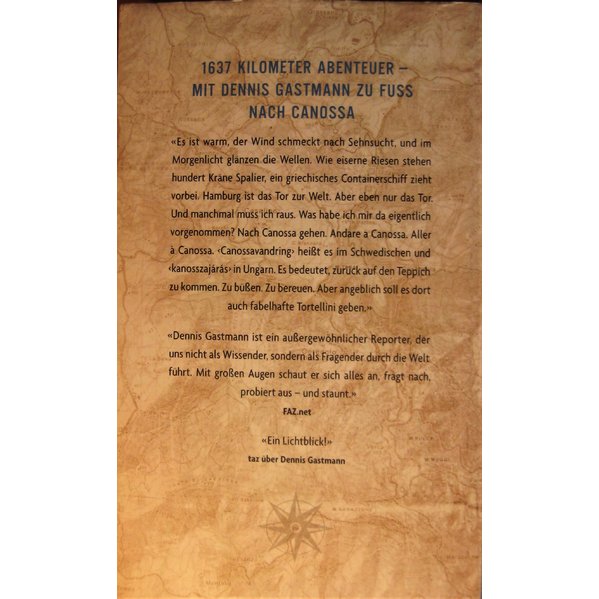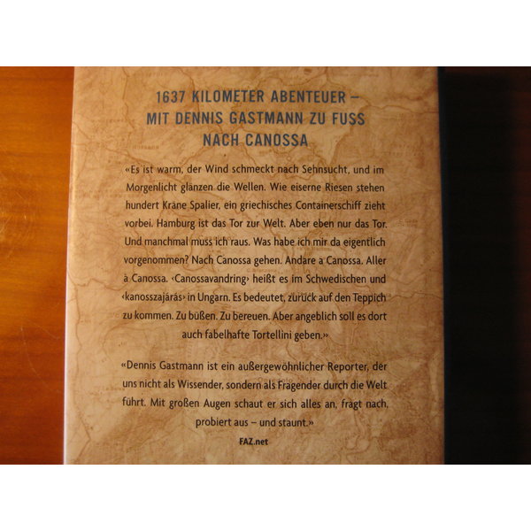 Wir schreiben das Jahr 2012: Die Wirtschaft ist am Ende, das Klima kaputt, bald soll auch noch die Welt untergehen, und in einem kleinen Apartment im Herzen Hamburgs schnürt ein blonder Reisereporter seinen Rucksack. Sein Ziel: die eigenen Sünden büßen und Mutter Erde ein wenig besser machen. Sein Problem: Dafür muss er über die Alpen. Zu Fuß. Fast eintausend Jahre nach Heinrich IV. tritt wieder ein Deutscher den legendären Weg nach Canossa an. Natürlich auch, weil es dort so tolle Tortellini geben soll. Dennis Gastmann führt uns auf seiner ungewöhnlichen Pilgerreise von einer Grenzerfahrung in die nächste: An einem geheimen Ort in Ostwestfalen lässt er sich von einem Orakel die Zukunft vorhersagen, in Frankfurt wagt er sich aufs Börsenparkett, und in der pfälzischen Provinz stattet er den Zeugen Jehovas einen Hausbesuch ab...