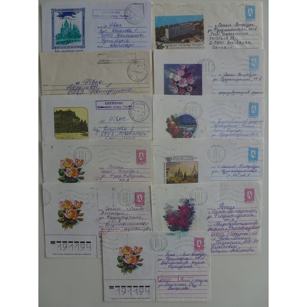 Auswahl an Umschlägen aus Rußland zum größten Teil mit vorgedruckten Marken, in jedem Fall gestempelt