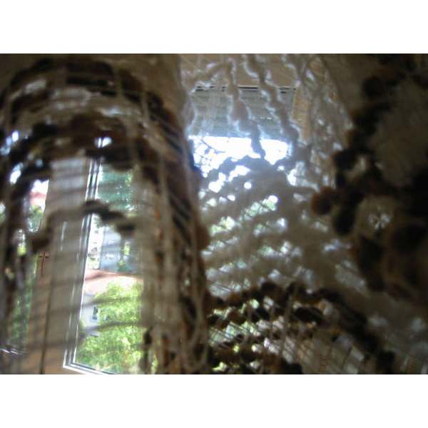 Gardine im Stil der 60er Jahre pflegeleicht Wollweiß und mit kupferfarbenem Web-Element, für ein ca 2m breites Fenster, ca 240 cm lang