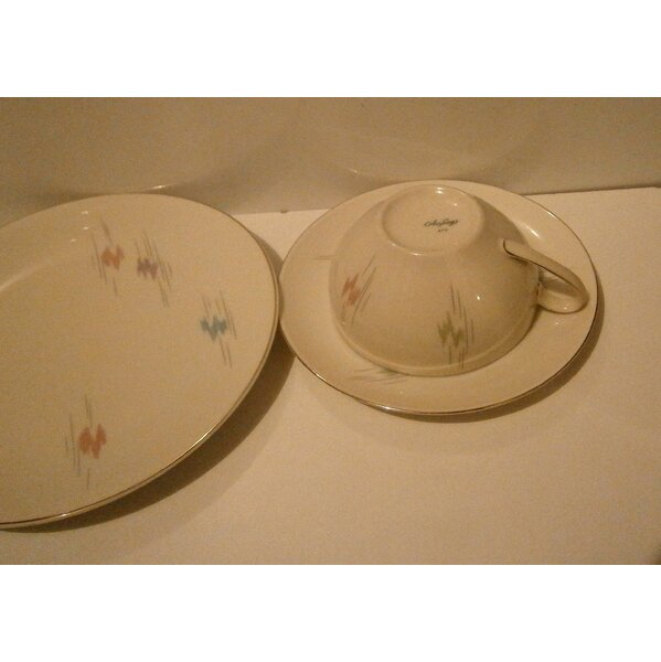 Schönes Gedeck von Arzberg, Tasse, Untertasse und Kuchenteller. Das Muster müßte dem Space-Age-Design zuzurechnen sein. Nach Stil und Machart aus Ende der 50er, Anfang der 60er Jahre, der Schreibschrift-Stempel wurde bis 1970 verwendet. Die Marke Arzberg wurde 2024 eingestellt.