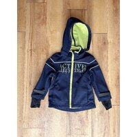 Die Kapuze ist abnehmbar (Reißverschluss), Manschetten an den Ärmelenden, die sich über die Finger ziehen (mit Loch für den Daumen), Reflektorenstreifen, Vordertaschen