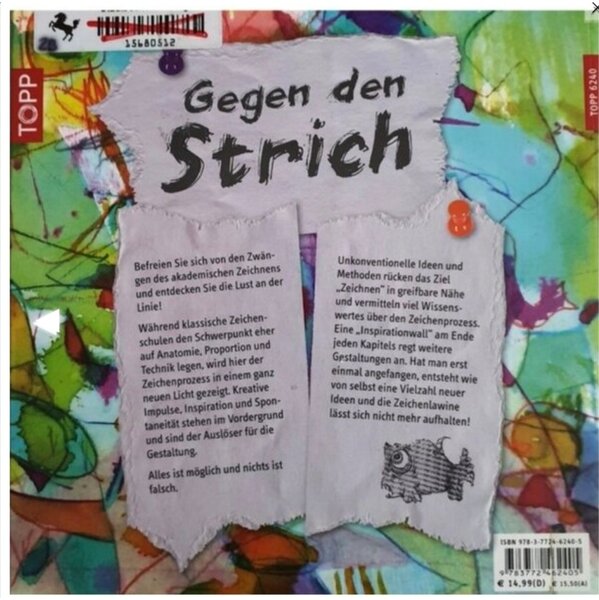 Gegen den Strich - Die Lust am Zeichnen neu entdecken. Die Lust an der Linie und die Leichtigkeit des Zeichnens entdecken durch eine Vielzahl an unkonventionellen Ideen, Impulsen und Inspirationen. Über das spielerische „Kritzeln“ zum Zeichnen kommen und dabei kreative Techniken für erstaunliche Zeichengründe kennenlernen. Experimentieren , Neues ausprobieren und die eigene Kreativität fördern – dabei helfen auch die „Inspirationwalls“ am Ende jeden Kapitels.