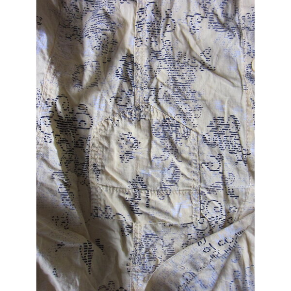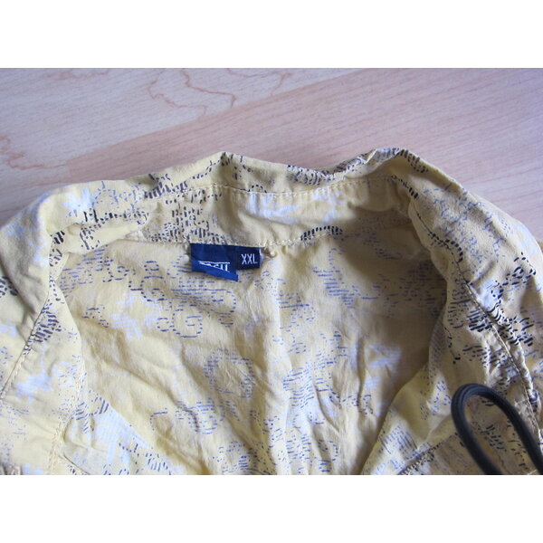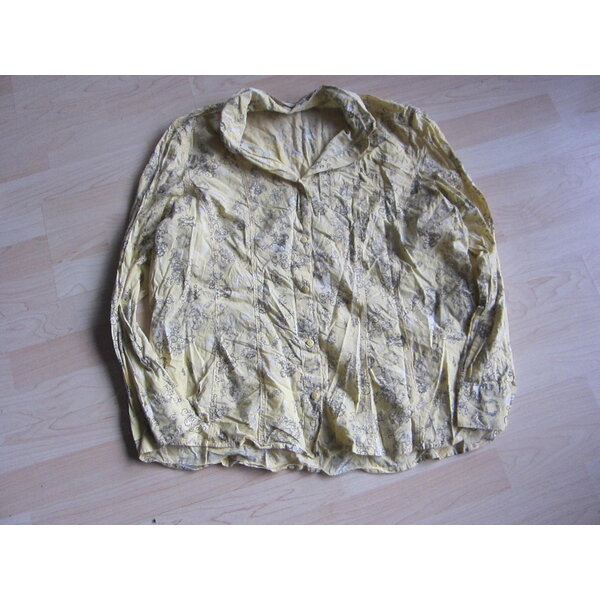 Die Bluse ist gelb mit einem Muster in weiß/grau und schwarz aufgedruckt. Die einfache Brustweite ist im Liegen gemessen 58 cm und die Gesamtlänge 65 cm vorne, hinten ein wenig länger. Aus 100% Baumwolle. Die Bluse kommt gewaschen aber nicht gebügelt zu ihnen.