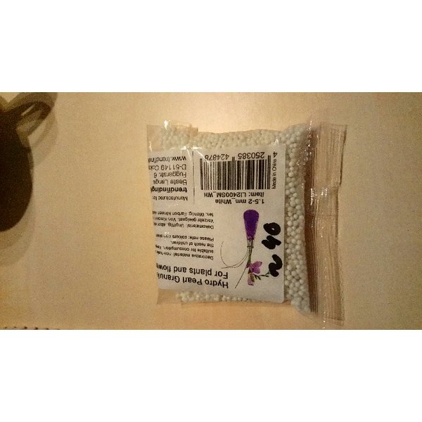 Weiße Gelkugeln zum selbst einweichen. Es sind noch ca. 40 gr in der Tüte. Genau kann ich es nicht sagen. Mit Tüte sind es 47gr.