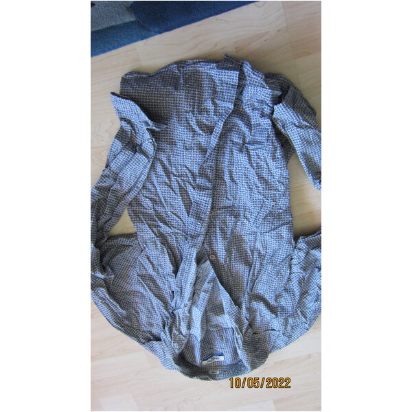Das Hemd hat ein Muster wie geflochten (siehe Foto). Mit normalem Kragen. Aus 100 % Baumwolle. Ersatzknopf ist noch vorhanden. Einfache Brustweite unter den Ärmeln gemessen ist 57 cm. Das Hemd kommt gewaschen, aber ungebügelt zu ihnen.