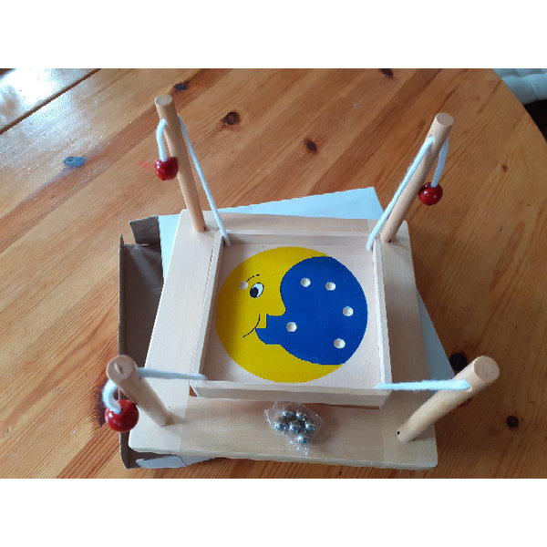 Geschicklichkeitsspiel für 2 Personen: durch Ziehen an den Fäden bewegt sich der Mond und die Kugeln gelangen in die vorgesehenen Löcher
